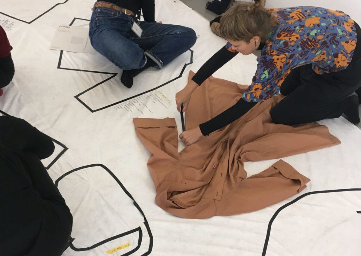 For every edition, participants are asked to take off a garment, lay it down on a large Tyvek sheet, outline their garment with tape and answer a series of questions regarding its production (Where was it made?), materials (What is it made of?), ownership (Is it yours?) and value (How much did it cost? What is the emotional value?). Subsequently connections are made between the garments by literally drawing lines between the items of the various visitors, creating a network that reveals connections between and intersections of personal, economic, social, cultural and political realms surfacing a complex and layered system of the reality of clothing.This culminates in a map, or landscape of personal stories that connect to form a fashion network which inverts our gaze, shining a spotlight on the intricacies of our own outfits and extraordinary aspects of the everyday as opposed to the myth of the exclusive fashion image. PORTAL thus provides an entryway to a vision that begins to prioritise values that are ephemeral and yet integral in “influencing hearts and minds and shaping the way we live together”. It captures and visualises information that circumvents established hierarchies and disrupts the homogeneity of the commercially driven fashion system with the refreshing diversity of fashion that is worn; embodied and imperfect.