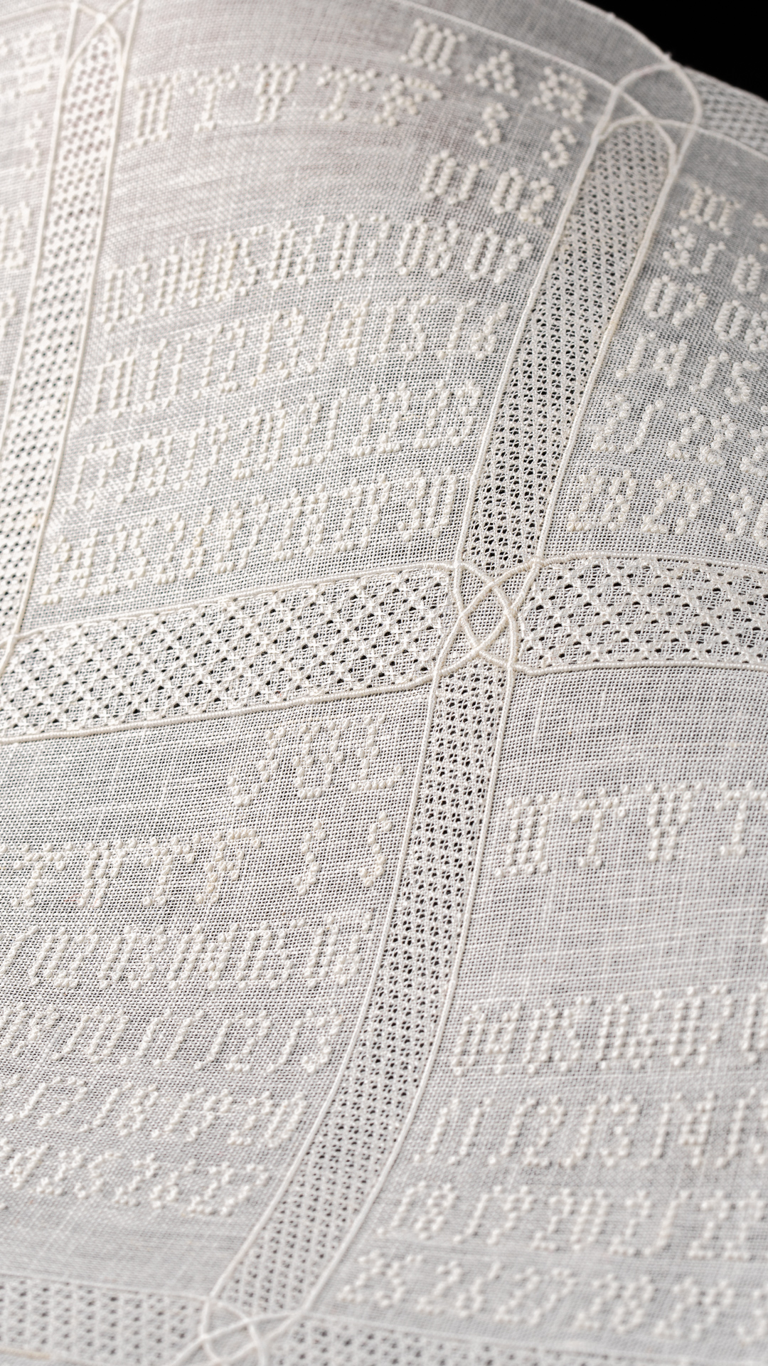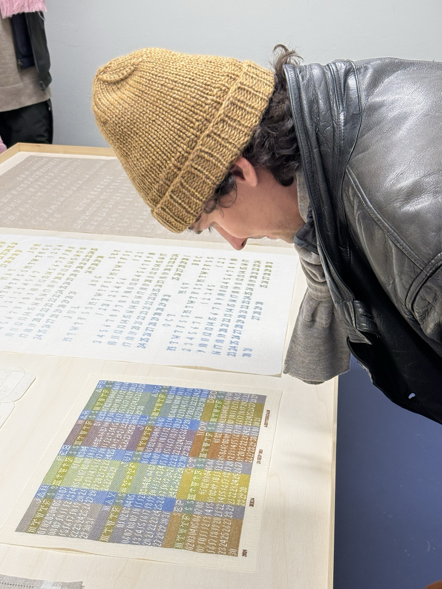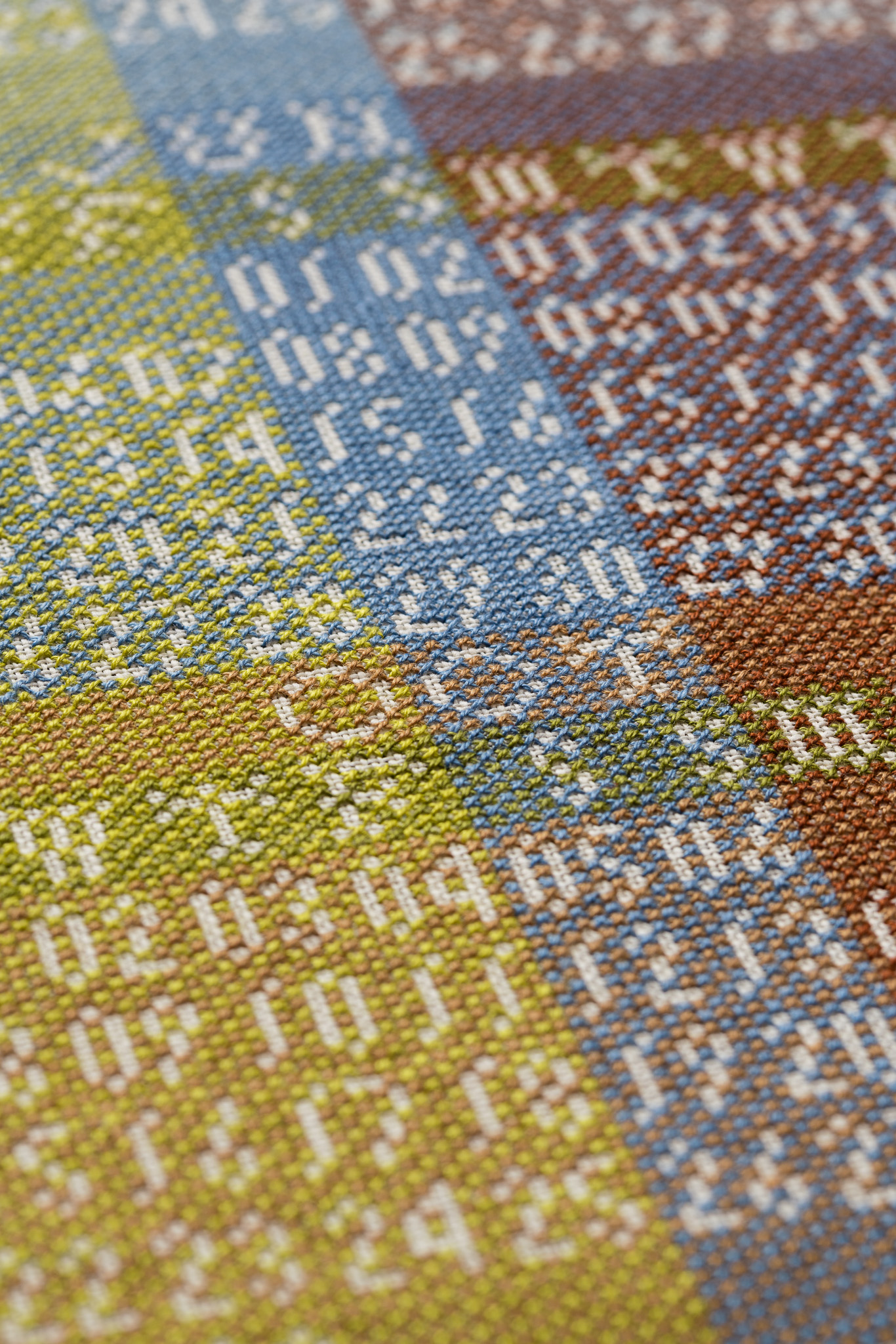 Calendar is a collaborative project by textile craftsperson and artist Masaki Komoto and graphic designer Yuri Sato. Initiated in 2021, the project uses needlework samplers as a starting point to explore various ways of bringing needlecraft and graphic design together. They search for fresh approaches to needlecraft by introducing aesthetics usually associated with graphic design, whilst simultaneously respecting centuries old techniques used in sewing and embroidery. For their calendar series, each yearly calendar draws on different ideas and phenomena associated with graphic design and needlework.