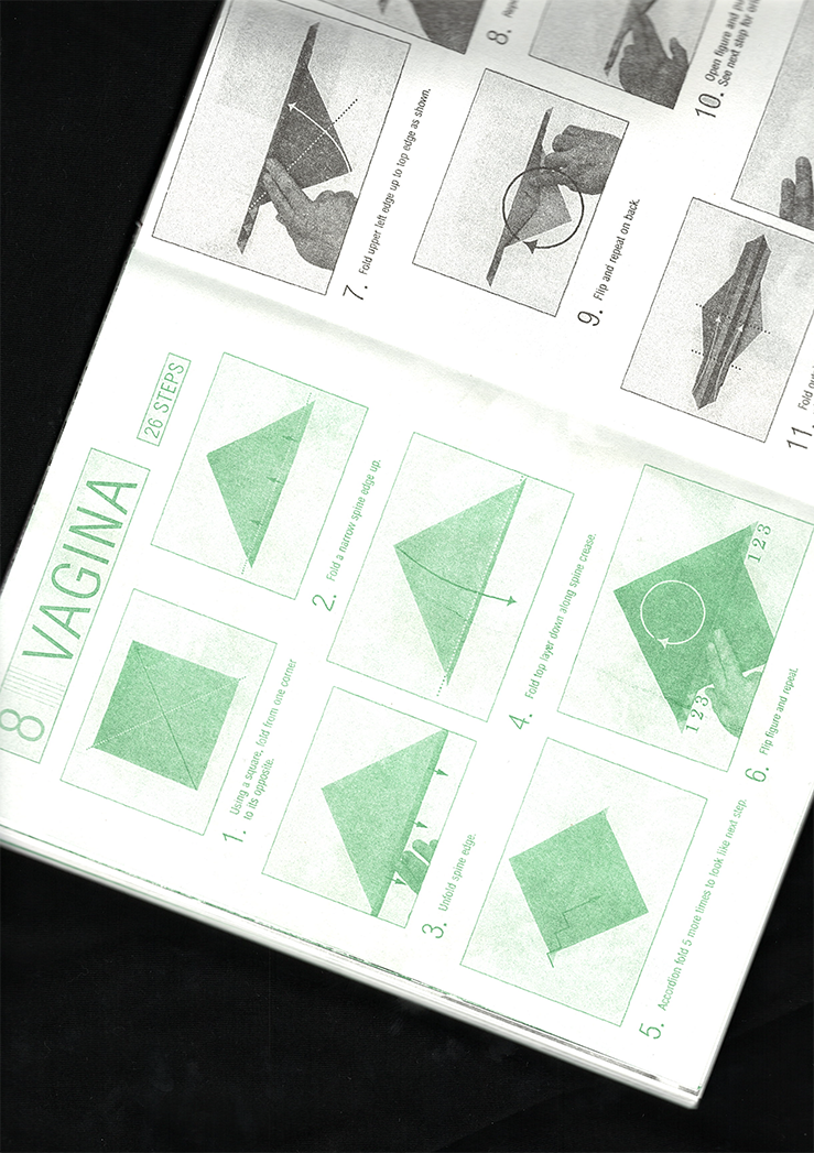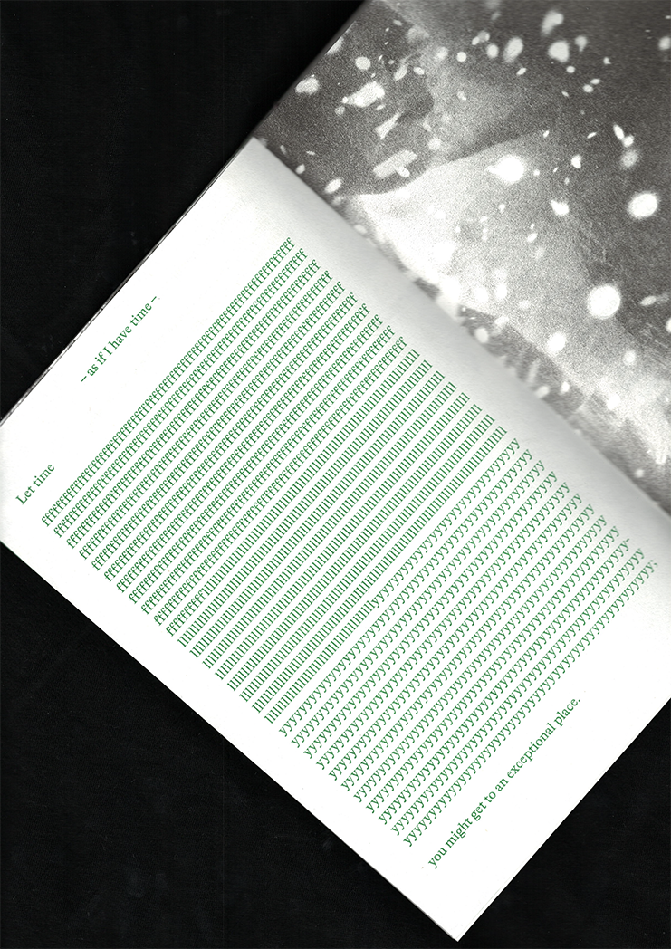 Type: softcover / Dimensions: 210 mm x 155 mm portrait / Pages: 162 / Art Direction: Femke de Vries and Hanka van der Voet / Authors: Alessandra Varisco, Annabelle Boer, Beau de Bruijn, Dalila de Vroom, Lianca van der Merwe, Sohyun Yoon, Wei-Chi Su, Yi-Jing Chen, Chet Bugter Femke de Vries, Hanka van der Voet/ Graphic design: Zuzana Kostelanská / Release date: Februari 2022 / Binding: elastic band / Edition: 200 / Color: green – riso printed / Printer: Kaboem / Language: English / Text editing: Femke de Vries, Hanka van der Voet, Chet Bugter and Lianca van der Merwe/ Production: Warehouse