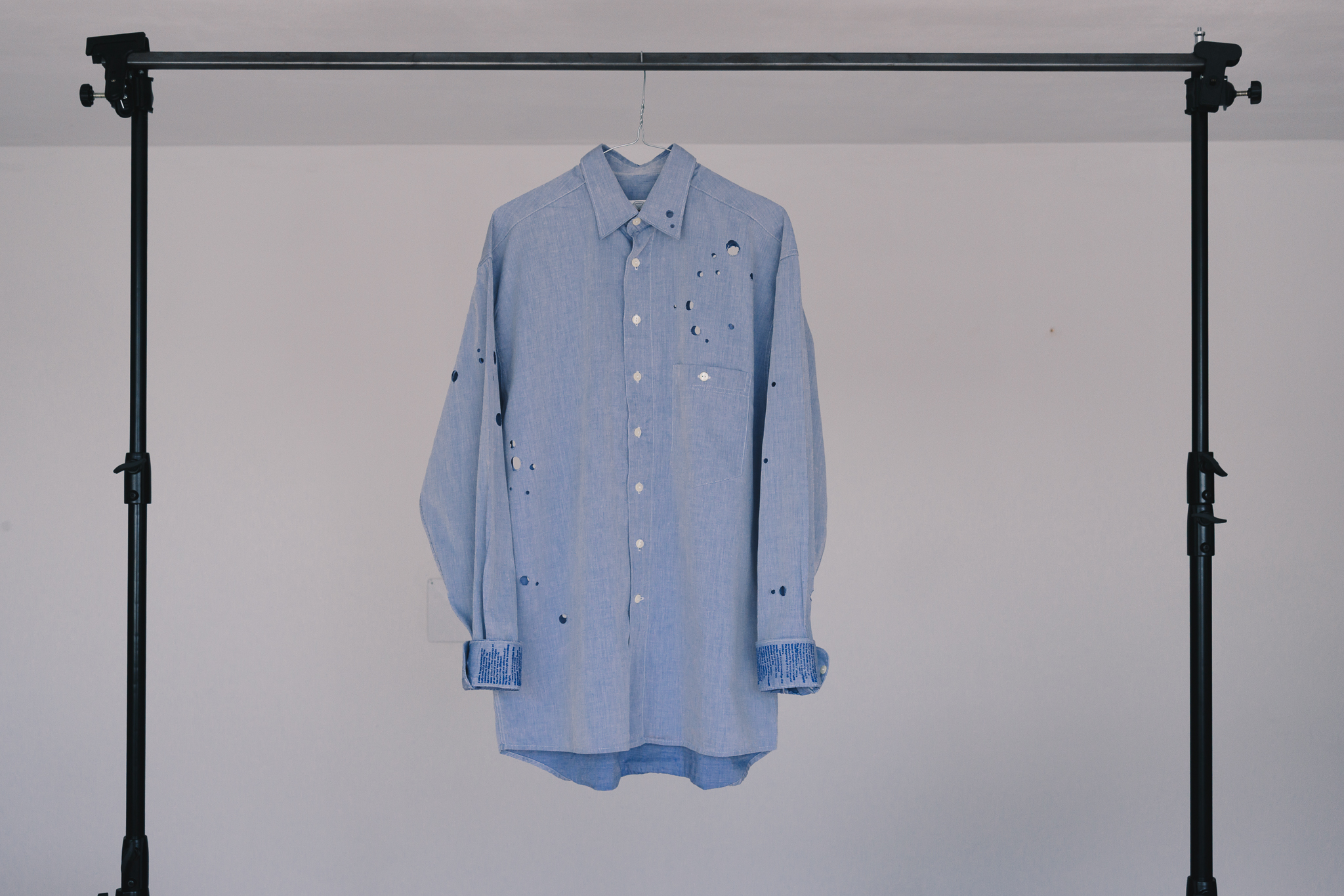 The holes in the shirts have been perforated by hand and are based on the star constellation called „Small Magellanic Cloud“. Undermining the actual purpose of a garment (protection), the holes in the fabric become a sort of glitch that partially reveals the body behind the „office shirt“. The perforation also stands in direct connection to the perforated screen of the film installation, which allows for the projected light to leak through.